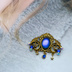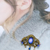 フロスト状になっていて、 美しいブルーバイオレットの光を放つ チェコガラスのブローチです。 とにかく、この美しい色彩に見惚れて 作品にしたい!と思い出来上がりました。 内部でろうそくの光が灯ったような 白く広がる内部反射の光と、 ブルーバイオレットの青紫の色彩が 本当に美しいブローチです。 藤や菫を思わせるような、透き通るような青紫の色彩に オーロラカラーとライトサファイアのオーストリアクリスタルガラスを両サイドに配置し装飾しました。 中央にはサファイアカラーの雫カットのガラスチャームをあしらい、 全体的にヴィンテージ感と青紫の色調を意識しました。 洋服の襟元に着けていただいたり、 マフラーやストール等の留め具としてもお使いいただけます。 ブローチの針にピアスの樹脂キャッチを つけています。 着けたい場所に針を通していただいて、 その後キャッチを通していただくと 落下防止になります。 。:*:★━━━━━━━━━━━━━━━━★:*:。 ◆◆おおきさ&カラーなど◆◆ チェコガラスカボション ブルーバイオレット 18mm×13mm 台座の大きさ 6cm×4.8cm 金具の色:ゴールド 装飾のクリスタルガラス:5mmサイズ ライトサファイア 3mmサイズ オーロラ 雫型のチャーム:ゴールド金具 サファイアカラーのカットガラス 15mm (カン部分を含む) 星型のチャーム:ゴールド金具 7mm