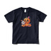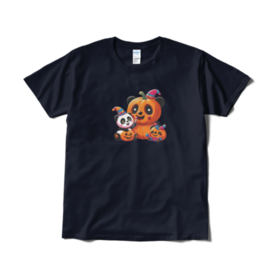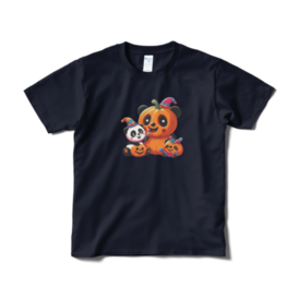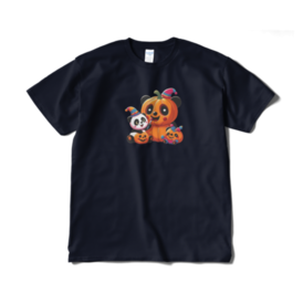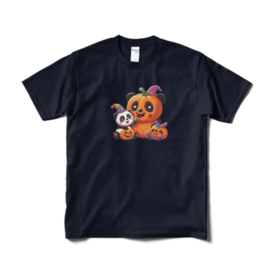 Tシャツ(短納期) - XL - ネイビー可愛いパンダの親子が、ハロウィンをお祝いする特別な瞬間を捉えた一枚。小さな子パンダがのんびりとお母さんのそばに寄り添い、ふたりはカラフルに囲まれています。 この商品はpixivFACTORYで作られた商品です。サンプル画像は完成イメージのため、実物と異なる場合があります。
