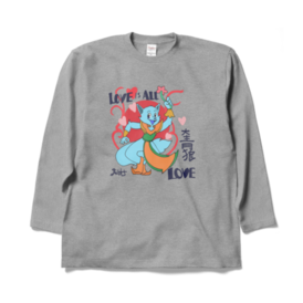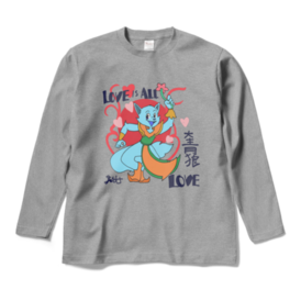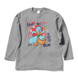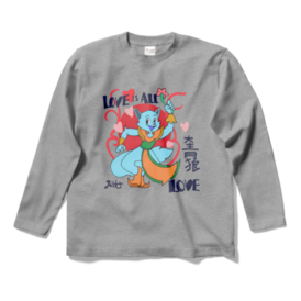 ロングスリーブTシャツ - XL - 杢グレー大青狼(だいせいろう)が花と愛を掲げる、元気いっぱいの「LOVE IS ALL LOVE」Tシャツ! 子どもも大人も楽しめる、明るい配色とポップなデザイン。愛と勇気、友情をテーマにしたキャラクターTシャツは、日常にもイベントにもぴったり! 背面には「LOVE」やハート、漢字「大青狼」がアクセントとして配置され、カラフルで目を惹く一枚です。 すべての年齢層に向けた、愛のメッセージが込められています。