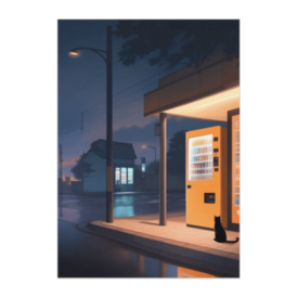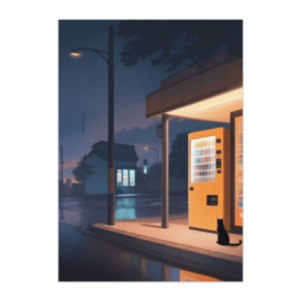 この商品はpixivFACTORYで作られた商品です。サンプル画像は完成イメージのため、実物と異なる場合があります。 夕暮れの街角、街灯と自販機が灯るバス停。 その足元には、ひとりの黒猫。 静けさと温もりが共存するアニメ風情景。