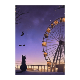 この商品はpixivFACTORYで作られた商品です。サンプル画像は完成イメージのため、実物と異なる場合があります。 星空の下、カボチャランタンが光る観覧車を見つめる黒猫。 静かな夜に広がる幻想的な光景が、どこかノスタルジックな気持ちを誘います。 ハロウィンの夜空をテーマにしたポスターです。