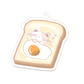 アクリルキーホルダー - 70 x 70 (mm)トーストのお布団、目玉焼きの毛布におねんね中のねこちゃん…。美味しい夢を見て幸せな様子。🤍🫧 ご覧いただきありがとうございます🍞𝟛