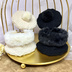 ■オフホワイト ニット風生地、裏地、ポンポン、ファー部分→生成及びオフホワイト ボタン、ファーティペットのリボン→ゴールド ■ブラック ニット風生地、裏地、ポンポン、ファー部分、ファーティペットのリボン→ブラック ボタン→ガンメタ