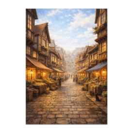 ポスター - B2この商品はpixivFACTORYで作られた商品です。サンプル画像は完成イメージのため、実物と異なる場合があります。 やわらかな昼の光が差し込む、幻想王国の市場通り。 木組みの家々と並ぶ露店が、穏やかな日常を感じさせます。 賑やかさの中にも落ち着きがあり、 お部屋に明るさと安心感を添えてくれるファンタジーアートです。