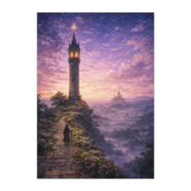 ポスター - B2この商品はpixivFACTORYで作られた商品です。サンプル画像は完成イメージのため、実物と異なる場合があります。 夕暮れから夜へと移ろう空の下、 高台にそびえる一本の塔が静かに輝きます。 幻想的な紫とピンクの空気感が、 非日常の美しさと物語性を強く印象づける一枚です。