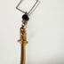 静かな闇を思わせるブラックビーズと、 無機質なスクエアフレームを繋ぎ、 その先に、鈍く光るゴールドの剣を添えたチャーム。 直線的で冷ややかな構成の中に、 剣という象徴的なモチーフが下がることで、 抑制された緊張感と、確かな存在感を生み出しています。 甘さを排した色合いと、 わずかな光沢だけが残る佇まいは、 感情を表に出さない強さや、 静かな覚悟を映すような印象です。 装飾性よりも意味を纏う、 凛とした空気を持つ一点。 ⸻ 【仕様】 ・カラー:ブラック/ゴールド/シルバー ・モチーフ:剣/スクエアフレーム ・金具:キーホルダー金具 【ご注意】 ・ハンドメイド作品のため、色味や配置に個体差があります。 ・金属パーツは経年や使用により風合いが変化する場合があります。 ・金属アレルギー非対応です。