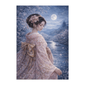 ポスター - B2この商品はpixivFACTORYで作られた商品です。サンプル画像は完成イメージのため、実物と異なる場合があります。 満月に照らされた夜の川辺に佇む、和装の女性を描いた幻想的な作品です。 桜の花と月光が織りなす静かな夜の情景が、穏やかな時間の流れを感じさせます。 和の美しさと幻想的な夜景を楽しめるアートポスターです。