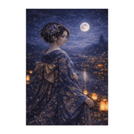 ポスター - B2この商品はpixivFACTORYで作られた商品です。サンプル画像は完成イメージのため、実物と異なる場合があります。 灯籠の明かりが水面に揺れる夜の情景を背景に、和装の女性を描いた一枚です。 深い青の着物と月光、温かな灯りの対比が幻想的な雰囲気を演出します。 夜の静けさと和の情緒を楽しめるアートポスターです。