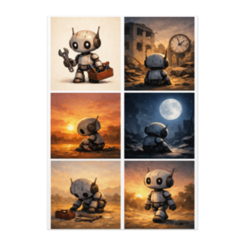 ポスター - B2この商品はpixivFACTORYで作られた商品です。サンプル画像は完成イメージのため、実物と異なる場合があります。 修理道具を手に、世界を直そうとした小さなロボット。 けれど、壊れたままの街は、何ひとつ元には戻らなかった。 夕暮れ、夜、そして朝。 何もできなかった時間が静かに重なり、 それでもロボットは、ほんの少し前を向いて歩き出す。 セリフのない物語を、6つの情景で1枚にまとめた ショートストーリー・ポスターです。 見る人それぞれの「役に立てなかった日」に、 そっと寄り添う一枚になれば幸いです。
