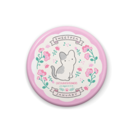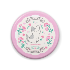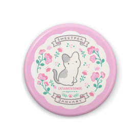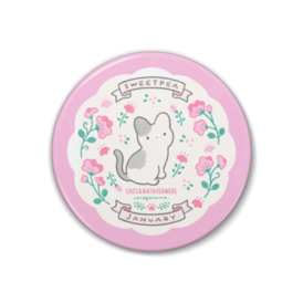 缶バッジ - 57mm【猫と誕生花:1月】 ✿スイートピー ✿花言葉:「門出」「優しい思い出」 1月生まれのみなさま、 お誕生日おめでとうございます💐🐈✨ この商品はpixivFACTORYで作られた商品です。 サンプル画像は完成イメージのため、実物と異なる場合があります。