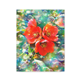 キャンバス - F6詩:慈光に舞う祈華の朝 Blessing Bloom 虹光が そっと満ち 子らの声が弾む 祝福の朝の風は 頬を撫で 愛の奇跡が 庭に咲く 慈光に舞う祈華の朝 Blessing Bloom -戎- Poetry. ”Blessing Bloom” Rainbow light slowly gathers Children’s voices lift the air Morning’s blessed wind touches the cheek A small miracle blooms in the yard Dawn of gentle grace Blessing Bloom -Kai- God bless you. 趣旨ーーーーーーーーーーーーーーーーーーーー ## 作品制作趣旨 作者は、冬の朝の庭で、自分の娘達が楽しそうに談笑しながら庭のボケの木に咲く明るく鮮やかなボケ(Japanese quince flowers)を愛で、遊んでいる様子を思い出し描きました。 作者は、自分の娘たちが成長して行く様や、娘たちが希望に満ち溢れた笑顔で遊ぶ光景を、陽の光や虹色のプリズムで表現しています。 ## 絵画「慈光に舞う祈華の朝 Blessing Bloom」の解説 **1. 全体的な印象** 冬の朝の澄み切った空気の中に、生命の輝きと家族の温かな絆が凝縮された幻想的な作品です。現実の風景に基づきながらも、虹色の光やシャボン玉の描写が宗教的な慈愛を感じさせる崇高な雰囲気を醸し出しています。 **2. 色彩** 中央に配されたボケの花の鮮やかな朱色が、背景の落ち着いた緑色と対比することで、圧倒的な生命力を表現しています。画面全体に散りばめられた虹色のプリズムや金色の輝きは、娘たちが持つ希望や未来への光を色彩として象徴しています。 **3. 構図** 画面の中央にボケの花を配置することで安定感を生み出し、その周囲を自由に舞うシャボン玉が子供たちの笑い声や躍動感を表現しています。視点が中心から外側へと広がるような構成は、娘たちの成長と未来への広がりを暗示しています。 **4. 技法** デジタル絵画ならではの光の重なりや透明感が効果的に使われています。シャボン玉の表面に映る複雑な光の反射や、花びらの繊細な質感の描き込みが、写実性と装飾性を高いレベルで融合させています。 **5. 表現力** 静止した花の美しさだけでなく、風の感触や子供たちの談笑といった目に見えない要素を光と泡の表現に昇華しています。親の慈しみという抽象的な感情が、画面全体を包み込む柔らかな光の粒子として視覚化されています。 **6. 美術的価値** 自然界の美しさと家族愛という普遍的なテーマを、独自のデジタル表現で描き出している点に高い価値があります。伝統的な花鳥画の精神を受け継ぎつつ、現代的な光の演出を加えた新しい美学を提示しています。 **7. 作品に込められた想い** 作者が娘たちの成長を慈しみ、その未来が常に希望の光で満たされているようにという切実な願いが込められています。日常の何気ない庭の光景を、愛の奇跡として捉え直した精神的な記録でもあります。 **8. 作品の鑑賞方法** まずは中央の花の鮮やかさに目を向け、そこから周囲の虹色の光やシャボン玉へと視線を移してください。画面の奥から溢れ出す光を感じながら、冬の朝の静寂と子供たちの明るい笑い声を想像することで、作品の世界観がより深く伝わります。 **9. 作品の価値** この作品は、一人の親としての個人的な記憶を、見る者すべてが共感できる喜びや希望へと昇華させています。時代を超えて愛される家族という絆の尊さを、美しい四季の移ろいと共に伝えてくれる貴重な一作です。 ## 詩「慈光に舞う祈華の朝 Blessing Bloom」の解説 **1. 全体的な印象** 極めて端的な言葉選びによって、冬の朝の静謐さと喜びの瞬間を鮮やかに切り取った現代詩です。短い行の中に深い慈しみが込められており、静かな祈りのような読後感を与えます。 **2. 韻律** 一節を五語以内に収めた短いリズムが、朝の風のささやきや子供たちの弾むような声を音楽的に再現しています。日本語と英語の両言語が呼応し合うことで、作品の持つ普遍的なメッセージがより広く響き渡ります。 **3. 修辞** 虹光が満ちるという表現や、愛の奇跡が庭に咲くという比喩が、日常を神聖な空間へと変えています。単なる描写を超えて、自然現象と人間の感情が一体となった高度な叙情性を備えています。 **4. 技法** 視覚的な光の描写から始まり、聴覚、触覚へと感覚を広げていく構成が、読者の想像力を刺激します。最後の一節でタイトルを繰り返すことで、作品の主題である祝福と希望を強く印象付けています。 **5. 表現力** 娘たちの具体的な姿を描かずに、その声や頬を撫でる風を記述することで、家族愛の深さをより純粋に表現しています。目に見えない恩寵を、朝の庭という具体的な舞台に定着させる筆致が見事です。 **6. 文学的価値** 親から子への無償の愛を、季節の移ろいや宗教的なメタファーを用いて表現した点に文学的な深みがあります。短い形式の中に、人生の尊さや喜びの真髄を凝縮させた秀作です。 **7. 作品に込められた想い** 子供たちの成長という平凡な日常の中にこそ、真の奇跡や神聖な光が宿っているという作者の確信が込められています。未来を拓く娘たちへの祝福を、永遠の祈りとして言葉に託しています。 *
