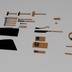 昔の大工道具類です。 大工道具の歴史は古く、縄文時代の石斧や石刃も大工道具の一種と言えます。 正倉院には鋸(のこぎり)や槍鉋(やりがんな)の一種も収蔵されています。 このモデルでは現在竹中大工道具展に収蔵されている、「桃山天満宮の道具一式」から多くを参照しています。 こちらは江戸時代後期(1841)に京都伏見の桃山天満宮の社殿を建てた大工が自分の大工道具一式を奉納したものです。 大工道具は高額なうえに道具として使われるものであるため、古い物がほとんど残っていません。 このためこうした大工道具が残っているのは非常に貴重な例となります。 そのほか「大鋸(おが)」は発展したのが明治であることから江戸・明治期の物をモデリングしました。 釿(手斧・ちょうな)、木の葉鋸・槍鉋(やりがんな)はさらに古い時代の道具類ですが、こちらは復元研究や発掘品の資料を基にモデリングしています。 詳細については冊子を作製予定です。(3月刊行予定)