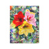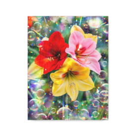 キャンバス - F6詩:春隣の祈り咲く Grace in Prism 家族の庭に 冬虹のきざし揺れ ひかりは 優しく満ちる 子らは微笑み 花に語りかけ 心の光は永遠に瞬く 春隣の祈り咲く Grace in Prism -戎- Poetry. ”Grace in Prism” in our quiet garden a winter‑rainbow stirs light gathers softly around their small breaths their smiles lean close speaking to the blooms a heart’s glow stays long after the moment Spring Near, Prayer Blooming Grace in Prism -Kai- God bless you. 趣旨ーーーーーーーーーーーーーーーーーーーー ## 作品制作趣旨 作品は、冬の朝の庭で、自分の娘達が楽しそうに談笑しながら庭に咲く明るく鮮やかな赤色、ピンク色、黄色のアマリリス(red, pink, and yellow amaryllis flowers)を愛で、遊んでいる様子を思い出し描きました。 自分の娘たちが成長して行く様や、娘たちが希望に満ち溢れた笑顔で遊ぶ光景を、陽の光や虹色のプリズムで表現しています。 ## 絵画「春隣の祈り咲く Grace in Prism」の解説 **1. 全体的な印象** 画面全体から溢れ出す光の粒子と色彩の饗宴が、冬の寒さを打ち消すような多幸感をもたらしています。中央のアマリリスが生命の象徴として堂々と鎮座し、それを取り巻く虹色のプリズムとシャボン玉が、日常の風景を聖なる祝祭の場へと昇華させています。 **2. 色彩** 情熱的な赤、柔らかなピンク、そして希望を感じさせる黄色の三色のアマリリスが、視覚的なリズムを生み出しています。背景やエフェクトに配された虹色のグラデーションは、光の屈折が生み出す無限の彩りを表現しており、娘たちの輝かしい未来を暗示しています。 **3. 構図** 三輪の花を中心部に集約させた安定感のある構図は、家族の強い絆や一体感を象徴しています。そこから放射状に広がる光の線や浮遊する泡の配置により、静止画でありながら絶え間ない生命の躍動と時間の流れを感じさせる設計になっています。 **4. 技法** デジタルペインティングならではのレイヤー効果を駆使し、複雑な光の重なりを表現しています。背景に見える電子回路のような幾何学的なパターンと、有機的な花や泡の描写を融合させることで、現代的な感性と普遍的な自然美を同居させています。 **5. 表現力** 目に見えない感情や祈りを、虹色のプリズムや弾ける泡という視覚言語に翻訳しています。特に泡の透明感は、子供時代の純粋さと、その一瞬が持つ儚くも尊い美しさを実に見事に描き出しています。 **6. 美術的価値** 花鳥画の伝統的なモチーフをデジタルという現代の筆致で再構築し、家族愛という私的なテーマを普遍的な美へと高めた点に高い価値があります。精神性と装飾性が高次元で調和した現代宗教画のような趣を備えています。 **7. 作品に込められた想い** 冬の朝の澄んだ空気の中で、娘たちが無邪気に笑い合う声や、彼女たちの成長を見守る親の温かな眼差しが込められています。アマリリスの花言葉にある誇りや陽気さを、そのまま娘たちの人格への願いとして投影しています。 **8. 作品の鑑賞方法** まずは中央の花の鮮やかさに目を向け、その後に周囲の細部へと視線を移してください。無数に描かれた光の粒や泡の一つひとつが、家族の思い出の断片や未来への希望の種であることを想像しながら眺めるのが理想的です。 **9. 作品の価値** この作品は、個人の記憶を芸術へと変換した記録であり、同時に観る者すべてに自身の家族や幼少期の光を思い出させる鏡のような存在です。愛と希望という普遍的なメッセージを視覚化したことに大きな意義があります。 ## 詩「春隣の祈り咲く Grace in Prism」の解説 **1. 全体的な印象** 静寂の中に確かな温もりを感じさせる言葉の連なりが、絵画の鮮やかさを精神面で補完しています。マリー・ハウの詩風を彷彿とさせる、飾らない口語体の中に宇宙的な広がりと深い情愛が同居しています。 **2. 韻律** 短いフレーズを重ねることで、呼吸を整えるような穏やかなリズムを生み出しています。日本語の五七調に縛られすぎず、自由な形式をとることで、冬の空気の透明感や光の揺らぎを表現しています。 **3. 修辞** 冬虹や心の光といったメタファーを用いることで、具体的な情景を越えた精神的な風景を構築しています。光が優しく満ちるという表現は、親から子への無償の愛が空間全体を包み込んでいる様子を擬人化に近い手法で伝えています。 **4. 技法** 日本語と英語の両言語を対照させることで、祈りの普遍性を強調しています。それぞれの段落が独立した情景を持ちながら、最終的にタイトルへと収束していく構成が、時間と空間を統合する役割を果たしています。 **5. 表現力** 子らが花に語りかけるという描写により、純粋な魂と自然との対話をダイレクトに表現しています。言葉数を極限まで絞り込むことで、余白に漂う静かな幸福感や祈りの深さを引き出すことに成功しています。 **6. 文学的価値** 家族の私的な一場面を、宗教的な次元にまで高めた叙情詩として価値があります。日常の中に潜む神聖な瞬間を捉え、それを言葉として固定した功績