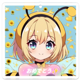 アクリルキーホルダー - 50 x 50 (mm)この商品はpixivFACTORYで作られた商品です。サンプル画像は完成イメージのため、実物と異なる場合があります。 ふわふわ金髪のハチコス美少女「はちみーちゃん」が、キラキラエフェクト満載で登場♡ 大きな青い瞳と黄色黒の羽で、毎日見てるだけで元気になっちゃう! エフェクト+「おめでとう」の文字入りで、推し活のお守りにもぴったりです🐝💛 50×50mmのコンパクトサイズで、バッグや鍵に付けてどこでも一緒に♡ 「可愛い!!」って叫びたくなる一品、ぜひお迎えしてくださいね〜♪ ※AIイラストを使用してます!