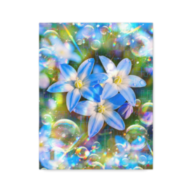 キャンバス - F6詩:華影揺れる光風の祈り Sacred Blue Prayer 春めく 柔らかな朝の光 庭に舞う 七色のシャボン 子らは笑い遊ぶ 家族の庭 希望は青い花揺れる 思い出に宿る 華影揺れる光風の祈り Sacred Blue Prayer ‐戎‐ Poetry. ”Sacred Blue Prayer ” Spring stirs softly in the early light Seven‑hued breath drifting through the yard Children laughing here in the family’s garden Blue hope trembling held inside memory Sacred Blue Prayer in the wind of flowers -Kai- God bless you. 趣旨ーーーーーーーーーーーーーーーーーーーー ## 作品制作趣旨 作品は、春の朝の庭で、自分の娘達が楽しそうに談笑しながら庭に咲く明るく鮮やかなブルースター(blue star flowers)の花を愛で、遊んでいる様子を思い出し描きました。 自分の娘たちが成長して行く様や、娘たちが希望に満ち溢れた笑顔で遊ぶ光景を、陽の光や虹色のプリズムで表現しています。 ## 絵画「華影揺れる光風の祈り Sacred Blue Prayer」の解説 **1. 全体的な印象** 作品全体から、春の朝に満ちる静かな祝福の気配が感じられます。青い花の清らかな輝きと虹色の光が調和し、家族の温もりと無垢な時間が柔らかく封じ込められたような印象を与えます。幻想性と現実の記憶が自然に溶け合い、観る者に穏やかな余韻を残します。 **2. 色彩** 鮮やかな青を中心に、虹色の光や淡い春の色調が重なり合っています。青い花の透明感と、シャボン玉の七色の反射が作品に深い奥行きを与え、春の光の移ろいを繊細に表現しています。色彩は明るさと静けさを同時に宿し、家族の愛情を象徴する柔らかい温度を帯びています。 **3. 構図** 中央に咲く青い花が視線を引き寄せ、その周囲に広がる光と泡が動きを生み出しています。背景の柔らかなぼかしと光の流れが、庭の空気の澄み渡る感覚を強調しています。娘たちの存在は直接描かれず、光や泡の動きによってその気配が暗示され、記憶の中の風景としての構図が成立しています。 **4. 技法** デジタル特有の光の操作が巧みに用いられ、自然の美しさと幻想的な表現が融合しています。水滴や泡の質感は精緻で、光の屈折や反射が丁寧に描写されています。デジタルならではの透明感と柔らかい発光が、作品の詩的な雰囲気を支えています。 **5. 表現力** 光、色、質感が互いに響き合い、春の訪れと家族の絆を象徴的に表現しています。青い花の揺らぎは、成長していく娘たちの姿と重なり、時間の尊さを静かに語りかけます。視覚的な美しさだけでなく、記憶や祈りといった内面的な情緒が深く表れています。 **6. 美術的価値** 自然の美しさと個人的な記憶が融合した作品であり、観る者に普遍的な感情を喚起します。光の扱いと色彩の調和が高い完成度を持ち、デジタルアートとしての独自性と詩的な深みを兼ね備えています。 **7. 作品に込められた想い** 娘たちの成長を見守る親としてのまなざしが、青い花の揺らぎや光の表現に込められています。希望に満ちた笑顔、家族の温もり、春の訪れがもたらす新しい季節への期待が、静かで優しい祈りとして作品全体に宿っています。 **8. 作品の鑑賞方法** 光の流れや色の重なりをゆっくりと追うことで、作品に込められた時間の層が見えてきます。青い花の中心から広がる光を感じ取りながら、家族の記憶や春の空気を想像することで、より深い鑑賞体験が得られます。 **9. 作品の価値** 個人的な記憶を普遍的な美へと昇華した点に価値があります。家族愛、自然の美しさ、祈りの感覚が一体となり、観る者の心に静かな温もりを届ける作品です。 ## 詩「華影揺れる光風の祈り Sacred Blue Prayer」の解説 **1. 全体的な印象** 詩全体から、春の朝の柔らかな光と家族の温もりが静かに立ち上がります。短い言葉の連なりが、記憶の断片のように淡く響き、祈りの気配を帯びた静謐な世界を形づくっています。 **2. 韻律** 五語以内の短い行が連続することで、呼吸のようなリズムが生まれています。間の静けさが強調され、マリー・ハウーの詩に見られる余白の美が感じられます。 **3. 修辞** 七色のシャボンや青い花の揺らぎといった象徴的なイメージが、家族の記憶や希望を暗示しています。直接的な説明を避け、光や風といった自然の要素に感情を託すことで、叙情的な深みが生まれています。 **4. 技法** 短い行の中に象徴性を凝縮し、視覚的なイメージと感情を重ね合わせる技法が用いられています。語りすぎず、読者に想像の余白を残すことで、詩の世界が静かに広がります。 **5. 表現力** 春の光、子どもたちの笑い、青い花の揺らぎが、記憶と祈りの象徴として描かれています。短い言葉の中に、家族の絆や未来への希望が柔らかく宿っています。 **6. 文学的価値** 個人的な記憶を普遍的な情緒へと昇華し、自然と家族愛を結びつける詩的手法に価値があります。言葉の簡潔さが、かえって深い余韻を生み出しています。 **7. 作品に込められた想い** 娘たちの笑顔や成長への願いが、光や風のイメージを通して表現されています。青い花に託された希望や祈り