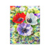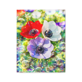 キャンバス - F6詩:虹光満つる光泡の聖庭 Sacred Radiant Hope 朝の光が揺れ 笑顔は 春の朝を呼ぶ シャボンは 祈りを抱き舞い 家族の未来は 微笑み咲く 虹光満つる光泡の聖庭 Sacred Radiant Hope -戎- Poetry. ”Sacred Radiant Hope” Morning light sways Children smile calls the day Soap bubbles Bright air holds a prayer Our future blooms in quiet In the garden of radiant hope -Kai- God bless you. 趣旨ーーーーーーーーーーーーーーーーーーーー ## 作品制作趣旨 作品は、春の朝の庭で、自分の娘達が楽しそうに談笑しながら庭に咲く明るく鮮やかな赤色、白色、薄い青紫色、ピンク色のアネモネ(red, white, pale blue-purple, and pink anemones flowers)の花を愛で、遊んでいる様子を思い出し描きました。 自分の娘たちが成長して行く様や、娘たちが希望に満ち溢れた笑顔で遊ぶ光景を、陽の光や虹色のプリズムで表現しています。 ## 絵画「虹光満つる光泡の聖庭 Sacred Radiant Hope」の解説 **1. 全体的な印象** 画面全体が多幸感に満ちた光に包まれており、聖域のような静謐さと生命の躍動が共存しています。春の訪れを祝うような明るいエネルギーが鑑賞者の心に直接響く作品です。 **2. 色彩** 中央に配置されたアネモネの赤、白、紫が鮮烈なコントラストを放っています。背景には虹色のプリズムやパステル調の色彩が重なり、光の粒子が舞うような視覚効果を生み出しています。 **3. 構図** 三輪のアネモネを中央に据え、それを取り囲むように無数のシャボン玉が配置されています。画面全体に広がる円形のモチーフが、調和と無限の広がりを感じさせるバランスのとれた構成です。 **4. 技法** デジタルならではのレイヤー効果を巧みに使い、光の屈折や反射を幾何学的なパターンと融合させています。写実的な花の描写と抽象的な光の表現が一体となり、幻想的な空間を作り出しています。 **5. 表現力** 目に見えない家族への愛情や未来への希望を、光の粒や弾ける泡という形あるものに変換して表現しています。娘たちの笑顔や成長という抽象的なテーマが、色彩の輝きを通じて雄弁に語られています。 **6. 美術的価値** 植物の美しさを捉えるボタニカルアートの側面と、光の干渉を表現する抽象美術の側面が高度に融合しています。伝統的な花のモチーフを現代的なデジタル表現で再構築した独創的な作品です。 **7. 作品に込められた想い** 春の庭で遊ぶ娘たちの姿を永遠の記憶として留めたいという、親としての慈愛が込められています。アネモネの花言葉にある希望や純粋さが、子供たちの未来を祝福する光として描かれています。 **8. 作品の鑑賞方法** まずは画面全体の光の洪水を受け取り、その後に細かなシャボン玉や花びらの質感を眺めてください。光の中に隠された微細な文様を探ることで、作者の深い祈りを感じることができます。 **9. 作品の価値** 個人の家族的な経験を普遍的な美へと昇華させている点に大きな価値があります。観る者それぞれが自身の家族や大切な思い出を投影できる、深い共感性を備えた作品です。 ## 詩「虹光満つる光泡の聖庭 Sacred Radiant Hope」の解説 **1. 全体的な印象** 短い言葉の中に深い余韻が残る、祈りのような静かな詩です。日常の光景が聖なる一瞬へと昇華されていく過程が、息づかいを感じさせるリズムで綴られています。 **2. 韻律** 一節が短く区切られており、呼吸を整えるような穏やかなリズムを持っています。日本語と英語が互いに補完し合い、言葉の響きが層のように重なって心地よい調べを生んでいます。 **3. 修辞** シャボンが祈りを抱いて舞うという表現や、笑顔が春の朝を呼ぶという擬人化された描写が、日常の動作に宗教的な深みを与えています。目に見えない想いが可視化されるプロセスが叙情的です。 **4. 技法** マリー・ハウの詩風を意識した、飾り気のない直截的な言葉選びが特徴です。余白を活かした構成により、言葉と言葉の間に流れる静寂や家族の絆が強調されています。 **5. 表現力** 未来、希望、微笑といった肯定的な言葉を重ねることで、不確かな明日への確かな信頼を表現しています。個人的な家族へのメッセージが、光という普遍的なイメージを通じて読者の心に染み渡ります。 **6. 文学的価値** 現代詩としての平易さを持ちながら、アネモネの神話性や花言葉、宗教的な祝祷のニュアンスを内包しています。短い詩形式の中に、家族の絆と時間の尊さを凝縮させた文学的な深みがあります。 **7. 作品に込められた想い** 成長していく娘たちへの無償の愛と、その背中を静かに見守る親の決意が込められています。一期一会の瞬間の輝きを、永遠の言葉として刻もうとする作者の誠実な祈りが伝わります。 **8. 作品の鑑賞方法** 一語一語をゆっくりと、光が差し込む様子を思い浮かべながら音読してください。日本語の節と英語の節を交互に感じることで、意味を超えた魂の響きを感じることができます。 **9. 作品の価値** 言葉を最小限に削ぎ落とすことで、かえって感情の純度を高めている点に価値があります。