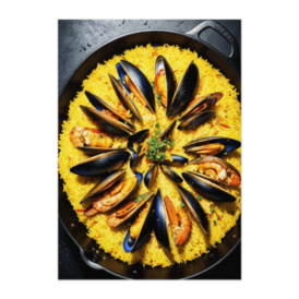 ポスター - B2この商品はpixivFACTORYで作られた商品です。サンプル画像は完成イメージのため、実物と異なる場合があります。 エビやムール貝が美しく配置された海鮮パエリアを描いたフードポスターです。 鮮やかな黄色のサフランライスと海の幸が印象的で、食卓の華やかさをそのまま閉じ込めた一枚です。
