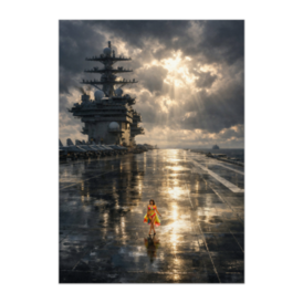 ポスター - B2この商品はpixivFACTORYで作られた商品です。サンプル画像は完成イメージのため、実物と異なる場合があります。 圧倒的スケールの空母デッキに、小さく佇むファッションモデル。 重厚でリアルな軍事空間と、鮮やかなカラー衣装の対比が生み出す、 静かで不思議な違和感と美しさを表現した作品です。 映画のワンシーンのような光と空気感、 そして“なぜここにいるのか”という余白を楽しめる、 シネマティック・シュールアートポスターです。 お部屋のアクセントやインテリアとしても映える一枚。