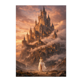 雲海に浮かぶ巨大城とドレスの女性 – ファンタジーシュールアートポスター