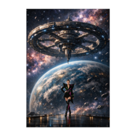 ポスター - B2この商品はpixivFACTORYで作られた商品です。サンプル画像は完成イメージのため、実物と異なる場合があります。 巨大な宇宙ステーションと惑星のスケール感の中に、 一人のファッションモデルが静かに佇む作品。 現実ではありえない組み合わせでありながら、 調和の取れた美しさが印象的な一枚です。 宇宙の壮大さとファッションの洗練が融合した、 シネマティックなアートポスター。 近未来的で幻想的な空間をお部屋に取り入れたい方におすすめです。