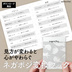 こちらは「ご自身でダウンロード・印刷していただく商品」です。 印刷・郵送の対応は行っておりませんのでご注意ください。 ダウンロードした時点でご利用規約に同意したものとみなします。 ご確認の上ご利用ください。 【 ご利用規約 】 個人のみご利用いただけます。 著作権は放棄しておりません。 著作権法ならびに以下の禁止事項に反しない範囲でご利用ください。 < 禁止事項 > [1]著作権者を名乗る行為 [2]データに関し、著作権登録、意匠登録、商標登録などの知的財産権の登録を行うこと [3]公序良俗に反する態様や、違法、虚像、誹謗、中傷、アダルト、風俗、暴力、差別、宗教、デモ、出会い系サービスに関連するものに利用すること [4]テレビCM広告、企業ロゴ・ブランドロゴ、アプリ内へ利用すること [5]データの一部か全部、または加工や組み合わせの有無に関わらず、データを利用して商品・製品を作成すること。無償のノベルティグッズやパッケージも含みます。 [6]データの一部か全部、または加工や組み合わせの有無に関わらず、データを再配布をすること。 なお本項の「再配布」とは、有償・無償に関わらず、書籍・CD-ROM・DVD-ROM等の媒体を利用する配布や、インターネット等の通信手段を利用する配布を意味します。 また、データをサーバー等にアップロードして送信可能状態にすることも含みます。 < 注意事項 > 予告なしにバージョンアップを行うことがございます。 一部の端末、ソフトウェアではご使用できない場合がございます。 Copyright 2026 GHITOE STUDIO - OSONO ---------- Before you buy, check the following: This is a digital product for you to download and print yourself. We do not offer printing or shipping services. It is assumed that you have agreed to the terms of use at the time of downloading. Please check before using. [ Terms of Service ] These materials are for personal use only. Copyright is not waived. Please use it within the scope that does not violate the copyright law and the following prohibited items. < Prohibited matter > [1] Acts of claiming to be the copyright owner [2] Registration of intellectual property rights such as copyright registration, design registration, and trademark registration for data [3]Using in a manner contrary to public order and morals, illegal, false image, slander, slander, adult, customs, violence, discrimination, religion, demonstration, dating service [4] Use in TV commercials, company logos/brand logos, and in apps [5] To create goods and products using data, whether in whole or in part, or with or without processing or combination. Also includes free novelty goods and packages. [6] Redistribute data in whole or in part, with or without processing or combination. In addition, "redistribution" in this section means distribution using media such as books, CD-ROMs, DVD-ROMs, etc., and distribution using communication means such as the Internet, regardless of whether it is paid or free of charge. It also includes uploading data to a server, etc. and making it ready for transmission. < Attention > We may update the version without notice. Some terminals and software may not be usable. Copyright 2026 GHITOE STUDIO - OSONO