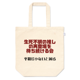 トートバッグ - M - プリント面積中推しが17年ほど生死不明で再登場待ちだったためヤケクソで架空の市民団体を作ってトートバッグにしたら、受取当日に更新された最新話で推しが出てきて半分くらい意味がなくなりました。 タイミングがマジでおもしろかったので、逆に縁起物かもしれません。生死不明の推しの再登場待ちの方は験担ぎにどうぞ(どんなだよ)。 Lサイズはマジでおもろいほど大きいです。 この商品はpixivFACTORYで作られた商品です。サンプル画像は完成イメージのため、実物と異なる場合があります。