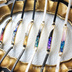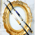 刀剣乱舞 三日月、小狐丸をイメージして製作したブレスレットです。 小狐丸→山吹色のシェルに金を散らしています。 紐は黒の牛革紐です。 三日月宗近→クリアブルーベースにホワイト・グレーのシェルを封入、瑠璃色の京都オパールフレークと金ホイルを散らしています。 紐部分は牛革です。 封入スタッズは三日月で、小さなスワロフスキーものせています。 衣装の雰囲気を出せるように制作しました。