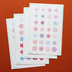 バラ曲線と呼ばれるグラフをデザインしたシール(直径15mmの丸シール)です。 そのまま貼って装飾にする、手帳に貼る、プレゼントのラッピングに使う、手紙の封緘にするなど、用途はさまざま。 極座標の方程式r=sin(nθ/d)またはr=cos(nθ/d)で表される曲線をバラ曲線(Rose curve)または正葉曲線と呼び、グラフに表すと美しい図形になります。このうちr=cos(nθ/d)のn、dの数値を変えた37種とこれに塗りを加えた19種の計56種を収録しました。 シール1片は直径15mmの円。はがきサイズのシート4枚に56種×2片収録。 全112ピース(28片×4シート) シールのサイズ 直径15mm 【素材】 ラベルシール マット紙・ホワイト 【サイズ】 幅100×高さ148mm(はがきサイズ) 【購入の際の注意点】 市販のインクジェットプリンタを使って印刷しているので、図柄がシールの円の中心からずれていることがあります。あらかじめご了承ください。 防水されていませんので紙濡れにご注意ください。
