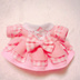 スカートは3種類の生地を重ね、袖は分かりづらいですがパフスリーブ、胸元の編み上げやリボンなど可愛いものを詰めこみました。