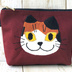 三毛猫!三毛猫可愛い! 三毛猫最高ーッ!! いつもバッグに三毛猫がいれば なんだか良い事が起こりそう 手作りの1点ものです。 ジグザグミシンでアップリケしてあります。 口元に少し綿が入っているので触るとフニフニして病みつきに。 化粧ポーチ、おやつ入れ、チケットや診察券を入れたり用途は様々。 存在感があるポーチなのでバッグの中でも目立ちます。 【仕様】 ファスナーサイズ 16cm ポーチのサイズ 約15.5cm×12cm マチのサイズ 4cm 表生地 帆布(キャンバス) ワイン色 猫部分 ツイル生地、ブロード生地 内生地 綿 黒地に銀でプリント 様々な素材を材料に用いています。 お洗濯はお控えください。 【著しい損壊等を除きノークレームノーリターンでお願い致します】