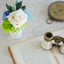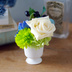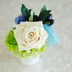 十二国記の尚隆をイメージしたプリザーブドフラワーアレンジメントです。 かなり小ぶりなので場所を選ばず、さりげなく飾れます。 ギフトにも便利なクリアケースに入れてお届けします。 緑の山野を模したライトグリーンのマム、瀬戸内の海の色のオーガンジーリボンとオリーブを添えました。 素材: ・プリザーブドフラワー ローズ、アジサイ ・アーティフィシャル(フェイク)フラワー マム、オリーブ、アジサイ ・その他 木馬オーガンジーリボン サイズ: クリアケースサイズφ10㎝×12㎝