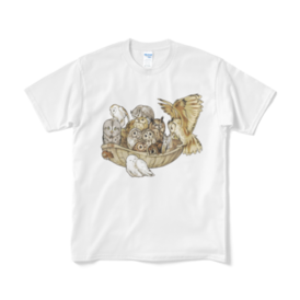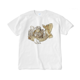 Tシャツ(短納期) - XL - ホワイトこの商品はpixivFACTORYで作られた商品です。サンプル画像は完成イメージのため、実物と異なる場合があります。 わーわーもふもふフクロウの盛り合わせです。
