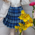 普段着にも制服風にも使える膝少し上くらいの丈の片側プリーツスカートです。 開きはかげひだの部分になっているのであわせめが目立ちません。 ペチコートを履かせたり、ブラウスをインしたりできるようにウエストは少しゆるめになっていますが、ペチコートなしでも履かせられます。 ペチコート(フリル)を中に履かせると裾からフリルがちらりと見えてかわいいですよ。