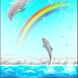 大海原を泳ぐイルカの親子。子供イルカはお父さんイルカのまねをしてジャンプの練習です。イルカがジャンプする度に、水しぶきがシャワーとなって降ってきます。子供イルカは、お父さんイルカのシャワーでできた、虹を捕まえようと必死です。