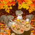 秋が深まり森の木々も秋色に染まる中、リスの親子はた〜くさん採れた木の実でランチです。切り株テーブルいっぱいに木の実を広げ、どんぐりのスープで体を温め、深まりゆく秋の景色と、秋の味覚を楽しんでいるのでしょうね。