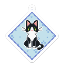 アクリルキーホルダー - 50 x 50 (mm)ドット絵「お座り」猫のアクリルキーホルダーです。 猫の毛色は「ハチワレ(タキシード)」、瞳の色は「緑」となっております。 ※この商品はpixivFACTORYで作っております。 サンプルは完成時のイメージ画像なので、実物の色とは多少異なります。ご了承ください。