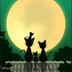 秋の空にまるまるとしたお月さまが顔を覗かせました。猫の親子は秋風に吹かれて屋根の上でお月見をしています。仔猫がお父さん猫に乗って手を伸ばして月を捕まえようと必死です。大きな美味しそうなおせんべいにでも見えたのかな。