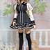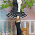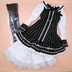 ■ミニワンピースカート スッキリしたパネルラインのミニワンピーススカートです。 黒地に白のラインが入ったストライプ生地。 身頃は、白の裏地付きですが、表生地や縫い糸などが出ている部分もあります。 胸元のリボンは縫い付けです。 後ろコンシールファスナー留めです。 ■ペチコートスカート 白綿ブロード生地とラッセルレース使用。 ウエストはゴムです。 ■オーバーニーソックス 黒のニット生地使用のオーバーニーソックスです。