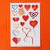 さまざまなタイプのハートを描いた転写タトゥーシールです。 画面上、白地に見える部分は実際には透明になります。 貼り付けたときには、写真とは左右反転します。 指で作ったハート、ハート型のリボン、ハート型の風船、手描き風のハートなど14点のハートを収録しました。 全14点 図柄のサイズ 長辺20×57mm程度。 水で湿らせて貼り付けるだけなので簡単。はがすこともすぐできます。 タトゥーシールとして肌につける以外にも、プラスチックや金属など表面がなめらかなものに貼り付けられます。 【素材】 市販の転写シール 透明タイプ 【サイズ】 幅100×高さ148mm(はがきサイズ) 【購入の際の注意点】 表面の粗いものにはきれいに転写できません。 水を使って転写させるため、紙など水に弱いものには転写できません。 肌に転写した場合は一日を目安にはがしてください。 シートは湿気を吸いやすい性質があるので、なるべく早めにお使いください。