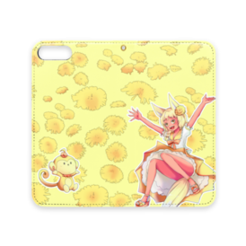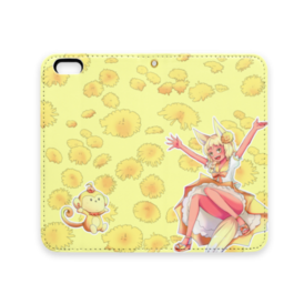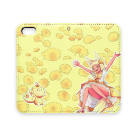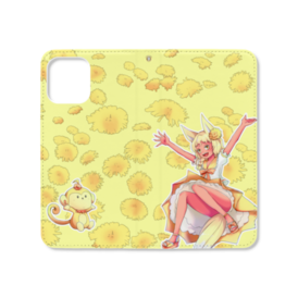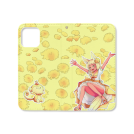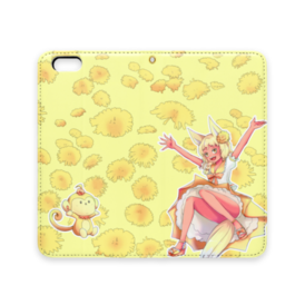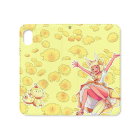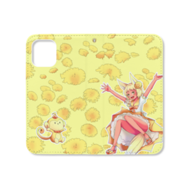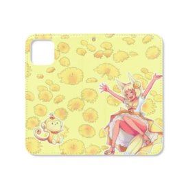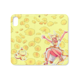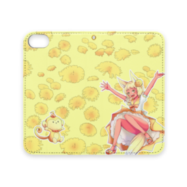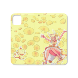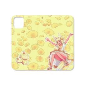 手帳型iPhoneケース(ベルトなし) - iPhone12 mini - ストラップ穴 あり黄色いタンポポのお花を背景に、ゆるいおさるさんと可愛い少女のキャラクターがデザインされた、手帳型iPhoneスマホカバーです この商品はpixivFACTORYで作られた商品です。サンプル画像は完成イメージのため、実物と異なる場合があります。