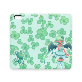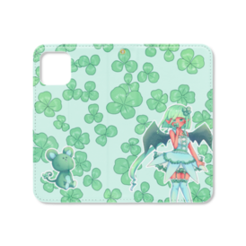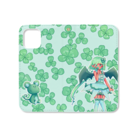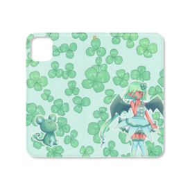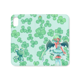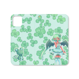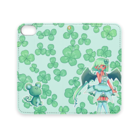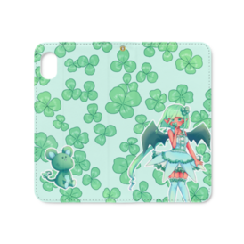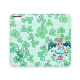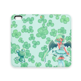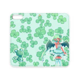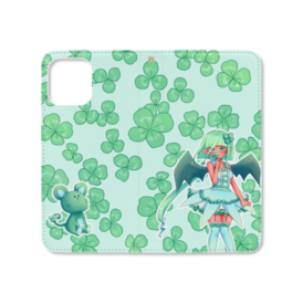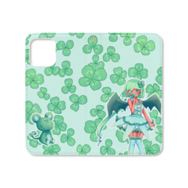 緑のクローバーを背景に、ゆるいネズミと可愛い少女のキャラクターがデザインされた、手帳型iPhoneスマホカバーです この商品はpixivFACTORYで作られた商品です。サンプル画像は完成イメージのため、実物と異なる場合があります。
