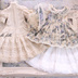 ・アンダードレス(アイボリー) アイボリーの綿ローン、リバーレース(エクリュ)を使用しています。 背中のスナップボタンにて着脱させてください。 重ね着する際に身頃がすっきりする様に裏地は付いていません。 アンダードレスを1枚で着てもかわいいです。 左側の袖にオリジナルのタグプレートを付けています。 ・エプロンドレス(青バラ柄) 薄手の綿プリント生地、リバーレース(エクリュ)を使用しています。 背中のスナップボタンで着脱させてください。 身頃のみ裏地付き。 ウエストのリボンにタグプレートを付けています。 ・ボンネット(青バラ柄) 薄手の綿プリント生地、綿ローン、リバーレース、トーションレースを使用しています。 レースリボンは首の前、うしろお好きな位置で結んでください。 片側のリボンにタグプレートを付けています。 ・アンダースカート(オフホワイト) 他のドレスセットでも使用できる様、アンダースカートはオフホワイトの生地を使用しています。 水通しできるものは一度水通ししてあります。 生地の端処理はロックミシンで、一部ピケを使用しています。