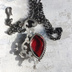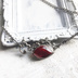 最初のイメージは、マハラジャのターバン飾りについている羽根。 それを唐草にデザインして、出来上がりました。 以前に作った物はターコイズで、だいぶ長さがあったので 唐草の部分がうまく石に収まったのですが。 今回のレッドアンバーはそこまで長さがなかったので、 石枠の上下に粒をつけました。 琥珀ですので、石よりもだいぶ軽いです。 フックを自作の物にして、 縦・横どちらでもつけれるようにしました。 甲丸チェーンに引っ掛けれるようにつくりましたので。 長さもいろいろ変えて着けれると思います。 チェーンの長さはフックを入れて48㎝ チェーンのみで44㎝ になります。 チェーンを短くはできますので、もし長いようであれば 備考欄におかきください。 出来上がている作品ですので、お支払い確認後 2~3日中に発送いたします。 950銀 純銀 甲丸チェーン:925銀 長さ48㎝ 石:レッドアンバー(琥珀)30×17㎜