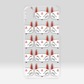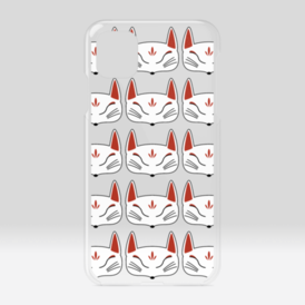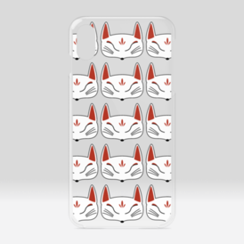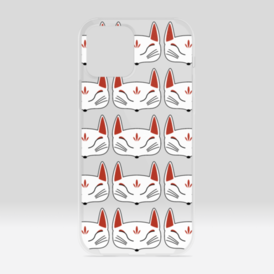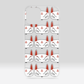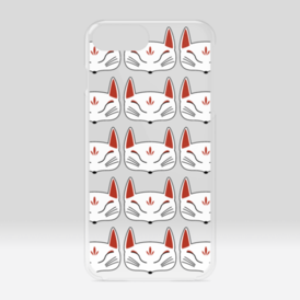 白狐面 総柄のクリアiPhoneケース。 白狐面、赤狐面、黒狐面を販売中。