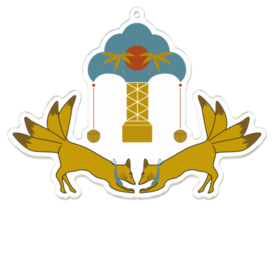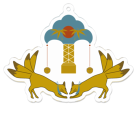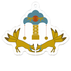 投扇興天狐 アクリルキーホルダー。 扇子を的の蝶に向かって投げる遊びの投扇興をする四尾の天狐たち。