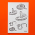 蛇の線画イラストを転写タトゥーシールにしました。 画面上、白地に見える部分は実際には透明になります。 貼り付けたときには、写真とは左右反転します。 マムシ、キングコブラ、サキシマハブの線画イラストをサイズにバリエーションをつけて収録しました。 全6点(サイズ大 3点、サイズ小 3点) 絵柄のサイズ サイズ大 幅50〜57mm、サイズ小 幅35〜40mm。 水で湿らせて貼り付けるだけなので簡単。はがすこともすぐできます。 タトゥーシールとして肌につける以外にも、プラスチックや金属など表面がなめらかなものに貼り付けられます。 【素材】 市販の転写シール 透明タイプ 【サイズ】 幅100×高さ148mm(はがきサイズ) 【購入の際の注意点】 表面の粗いものにはきれいに転写できません。 水を使って転写させるため、紙など水に弱いものには転写できません。 肌に転写した場合は一日を目安にはがしてください。 シートは湿気を吸いやすい性質があるので、なるべく早めにお使いください。