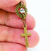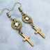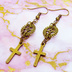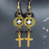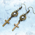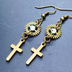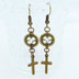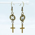 アンティークゴールド ロザリオ(十字架)と歯車を組合せたコンパクトなピアス ラインストーン