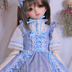 40㎝級ドール向けのセットです。 夏らしいさわやかな水色のストライプ生地のジャンパースカートと、半袖ブラウス、ヘッドドレスのセットです。