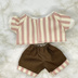こちらは20cmぬい用のブラウス+ズボン+エプロンのセットアップになります 試着ぬいぐるみサイズ 腰:20cm おしり:20.3cm うで:7.4cm 首回り:7cm 足周り:8.5cm 大体の大きさの参考にしていただければ幸いです。 生地の切り出し方によって柄が変わる可能性がございます。ご了承ください。 柄は以下の種類から選択できます。 ①いちごチョコ ②オレンジチョコ ③ミントチョコ ※こちらのお洋服は『てづくり推しぬいBOOK』『てづくり推しぬいBOOKお洋服編』の型紙を使用して作成しております