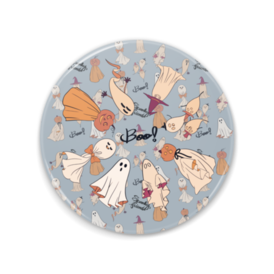 ハロウィンのオバケたちの集合イラストです。Spooky friends = 不気味なともだち。 サイズ 75mm 材質:ブリキ・OPPフィルム(クリア) 鏡部分 /ガラスミラー この商品はpixivFACTORYで作られた商品です。サンプル画像は完成イメージのため、実物と異なる場合があります。